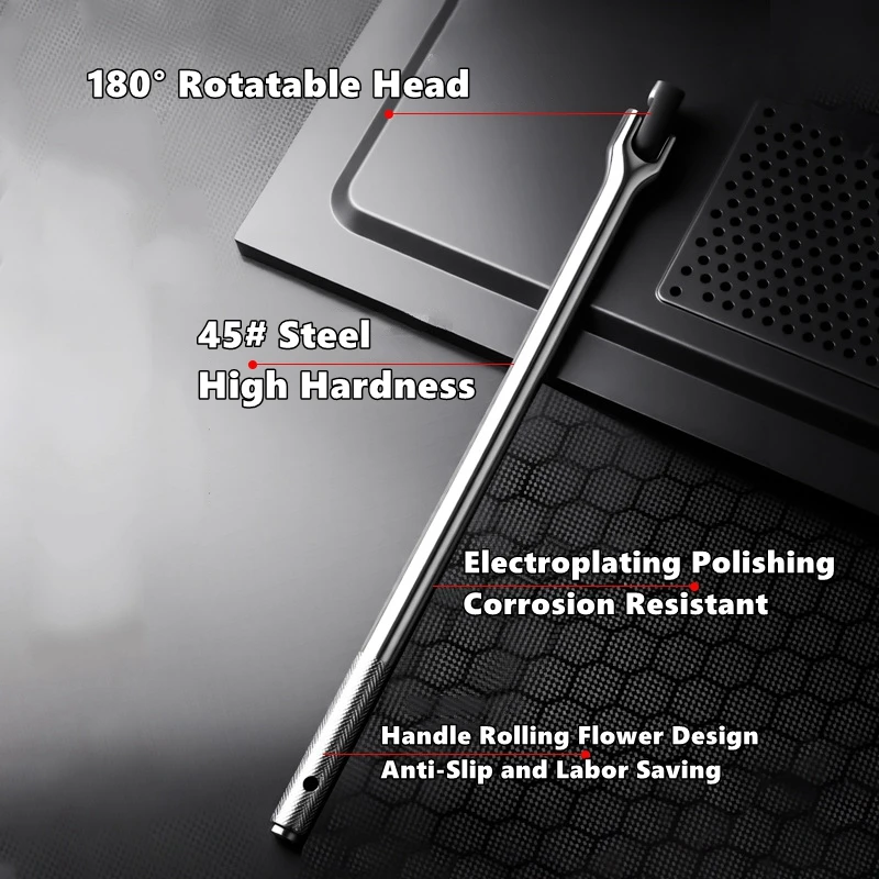 The rotating activity head provides flexible angles for accessing hard-to-reach spaces, while the heavy-duty steel construction ensures durability and long service life. Ideal for automotive repair, tire service, machinery maintenance, and workshop applications, this breaker bar provides the leverage needed for high-torque tasks without slipping or bending.