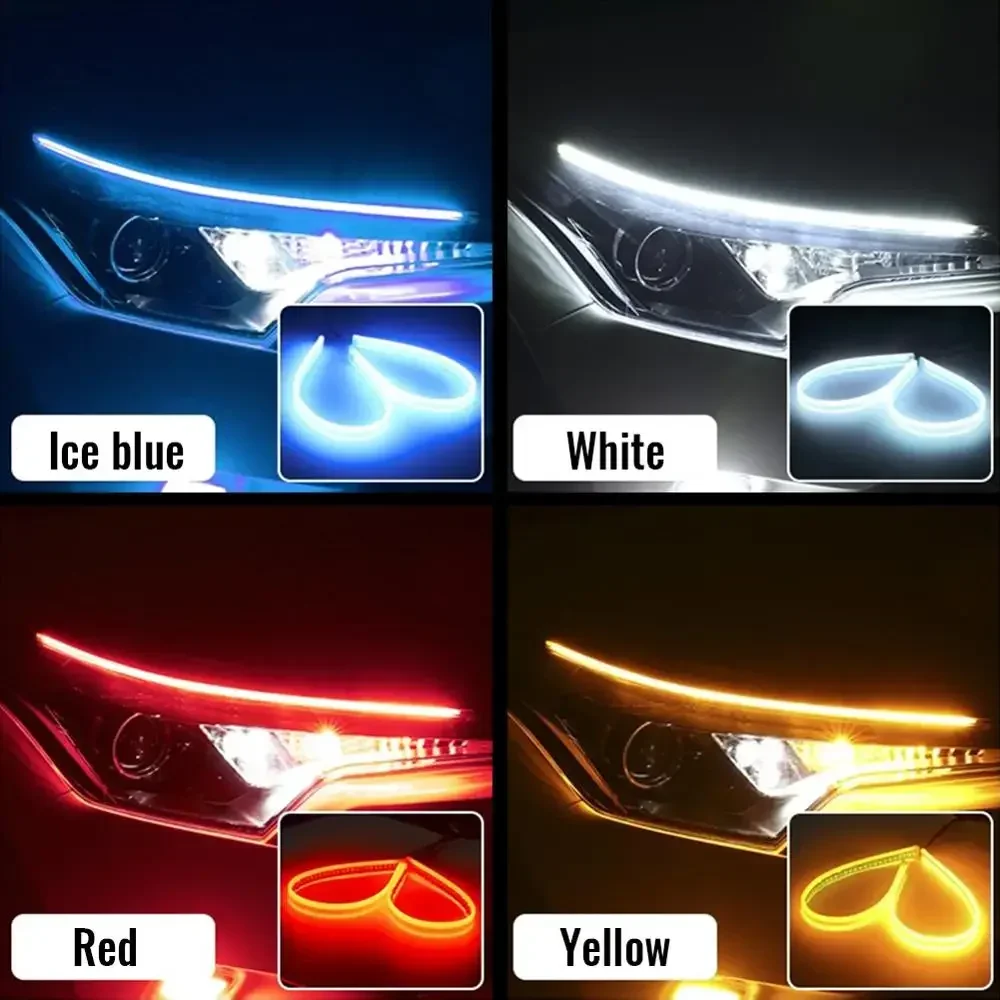 Upgrade your headlights with these 2PCS Flexible DRL LED Strip Turn Signal Lights, designed to provide both bright white daytime running light (DRL) and yellow flowing-sequential turn signal functions. Made from soft silicone tubing with high-brightness LED chips, the strips easily contour to any headlight design—ideal for modern vehicle styling and visibility improvement.