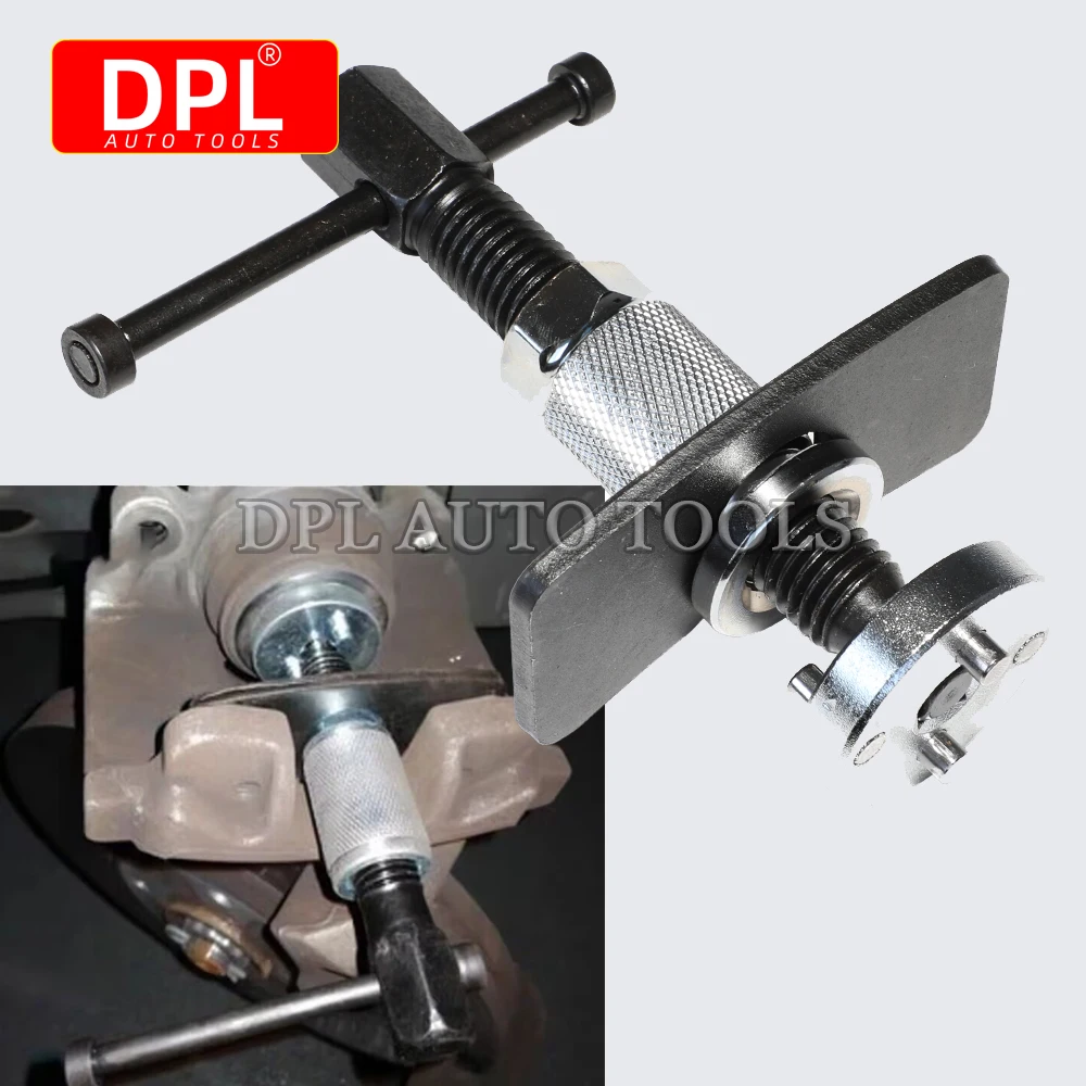 It includes essential hand tools for piston rewind, caliper separation, and brake component disassembly.