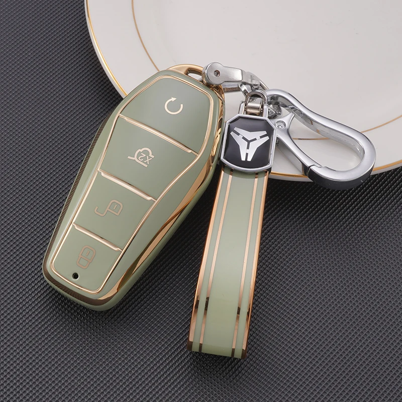 This TPU car key case is designed for BYD Atto 3, Han EV, and Dolphin remote controls with four buttons.