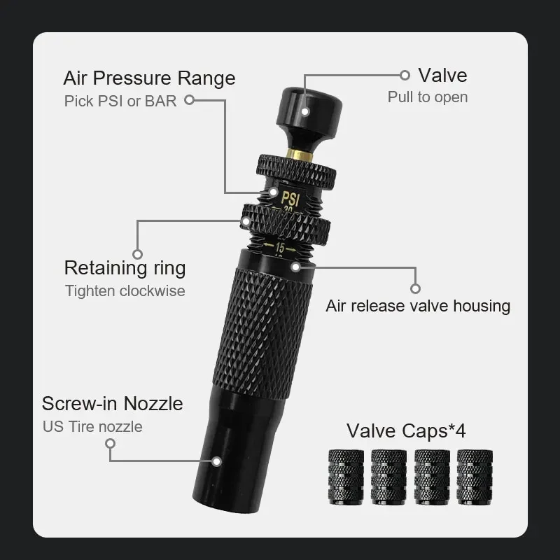 This 4pcs adjustable tire deflator valve kit is designed for fast and precise tire air-down.