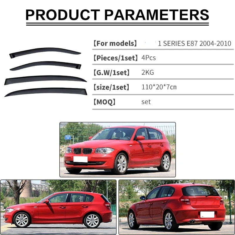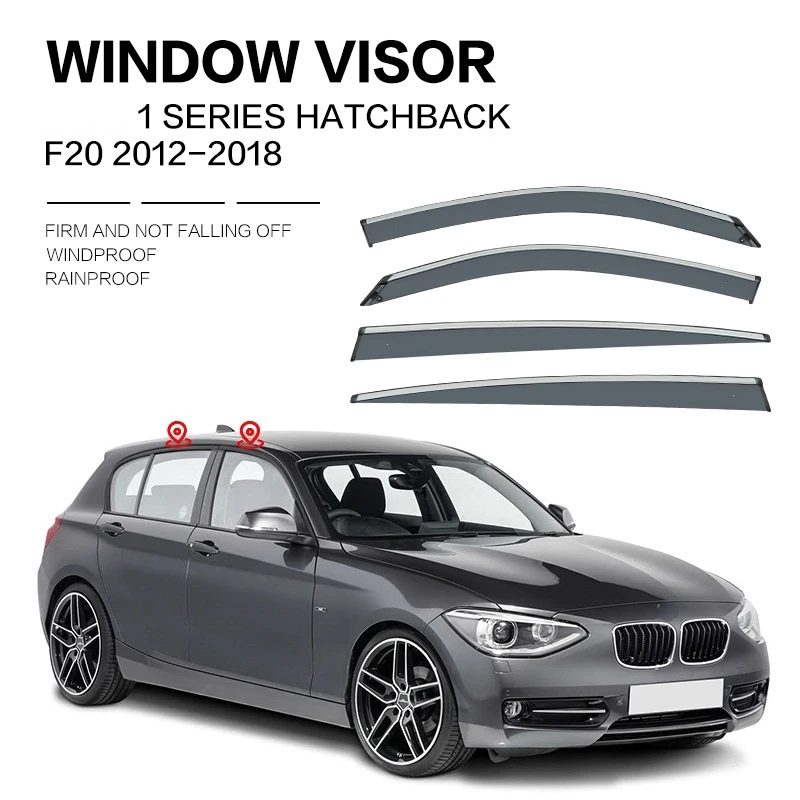 Enhance your BMW 1 Series (E87, F20, F52) with these Window Visors / Weather Guards / Door Vent Shades. Designed to protect your car interior from rain, wind, and sun glare, they allow ventilation while keeping windows slightly open. The bright strip adds a stylish touch to your vehicle. Made from durable, high-quality materials, these visors are easy to install and a practical automotive accessory.