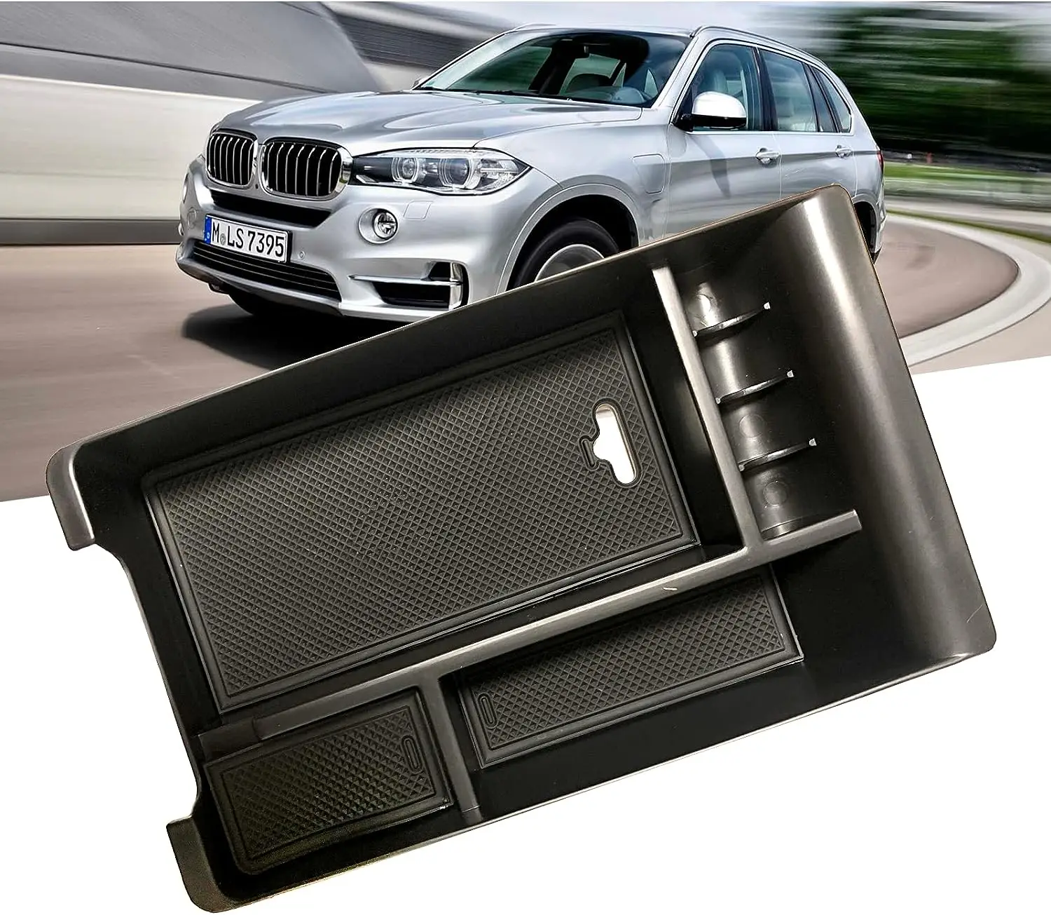 This center console organizer is designed to perfectly fit BMW X5 and X6 F15/F16 models from 2014 to 2017. It maximizes storage efficiency by dividing the console into practical, easy-to-reach compartments. The organizer tray sits securely without affecting the opening or closing of the console lid. Made from durable ABS material, it withstands daily use and maintains its shape over time. A non-slip rubber mat lining helps keep items from sliding or making noise while driving. It’s ideal for storing coins, cards, keys, cables, and other small essentials. Installation is effortless—simply place it into the existing console space. The sleek, OEM-style design blends seamlessly with the BMW interior. Its elevated layout keeps frequently used items within quick reach for added convenience. This tray provides a clean, organized solution for enhancing your vehicle’s cabin functionality.