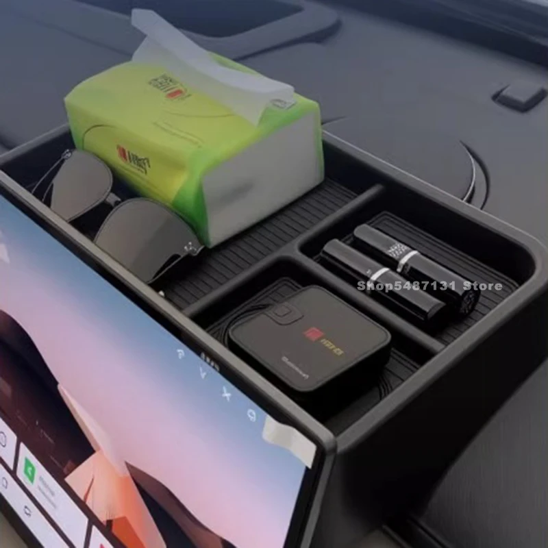 The storage box fits neatly around the dashboard screen area without affecting visibility.