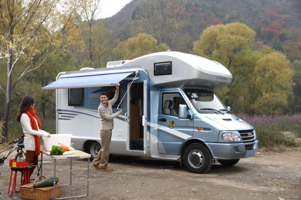 This motorized RV awning is designed for campers and caravans seeking comfort and convenience.