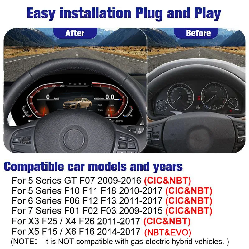 Upgrade your interior with this digital dashboard cluster designed for BMW 5, 6, and 7 Series as well as X3, X4, X5, and X6 models including F01, F07, F10, F15, F16, F18, F25, and F26.