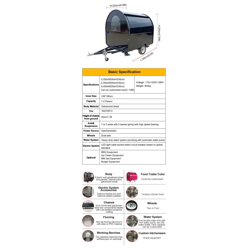This trailer is suitable for a wide variety of fast food, snacks, and beverage menus.