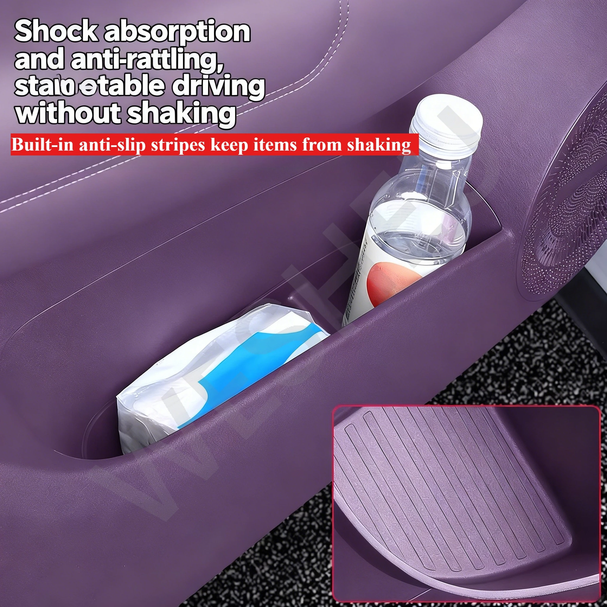 A storage pad design prevents items from sliding or rattling while driving.