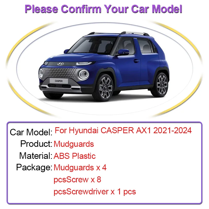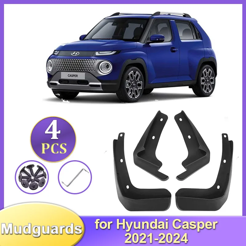 Protect your Hyundai Casper AX1 (2021–2024) with these Front and Rear Mudguards / Splash Guards / Fender Protectors. Designed to shield your vehicle from mud, dirt, rain, and road debris, they help maintain clean wheels and fenders while enhancing durability. Made from high-quality, durable materials, this 4-piece set is perfect for daily driving and adds a sporty, practical touch to your car.