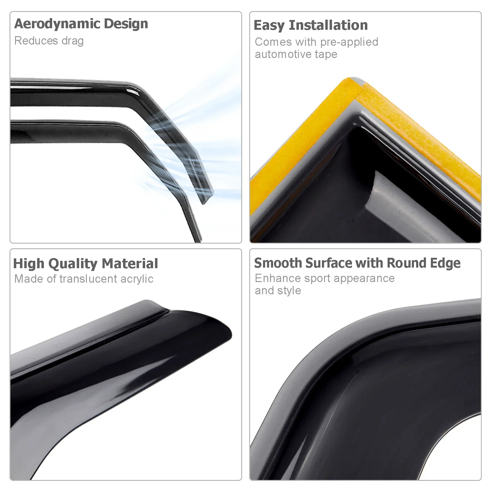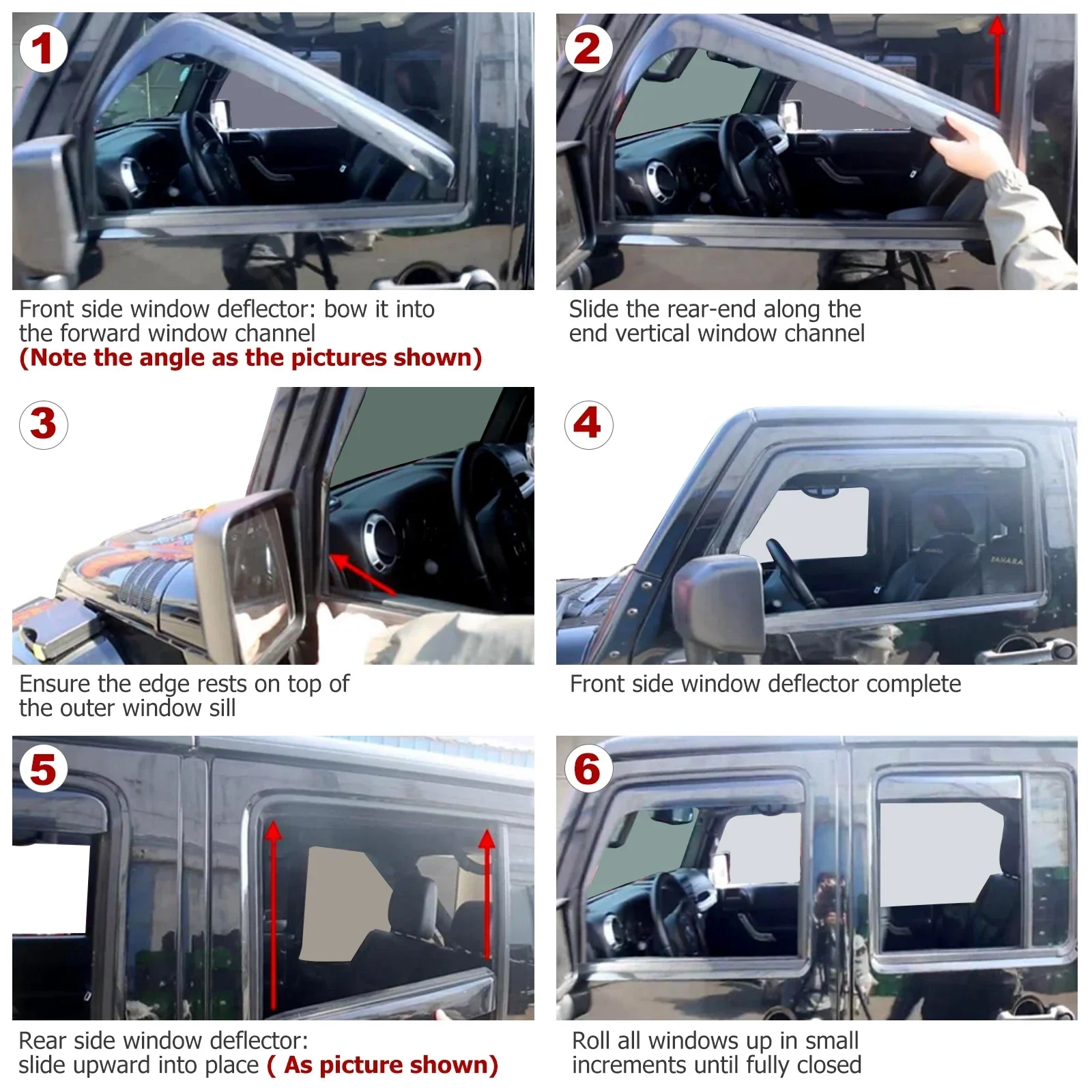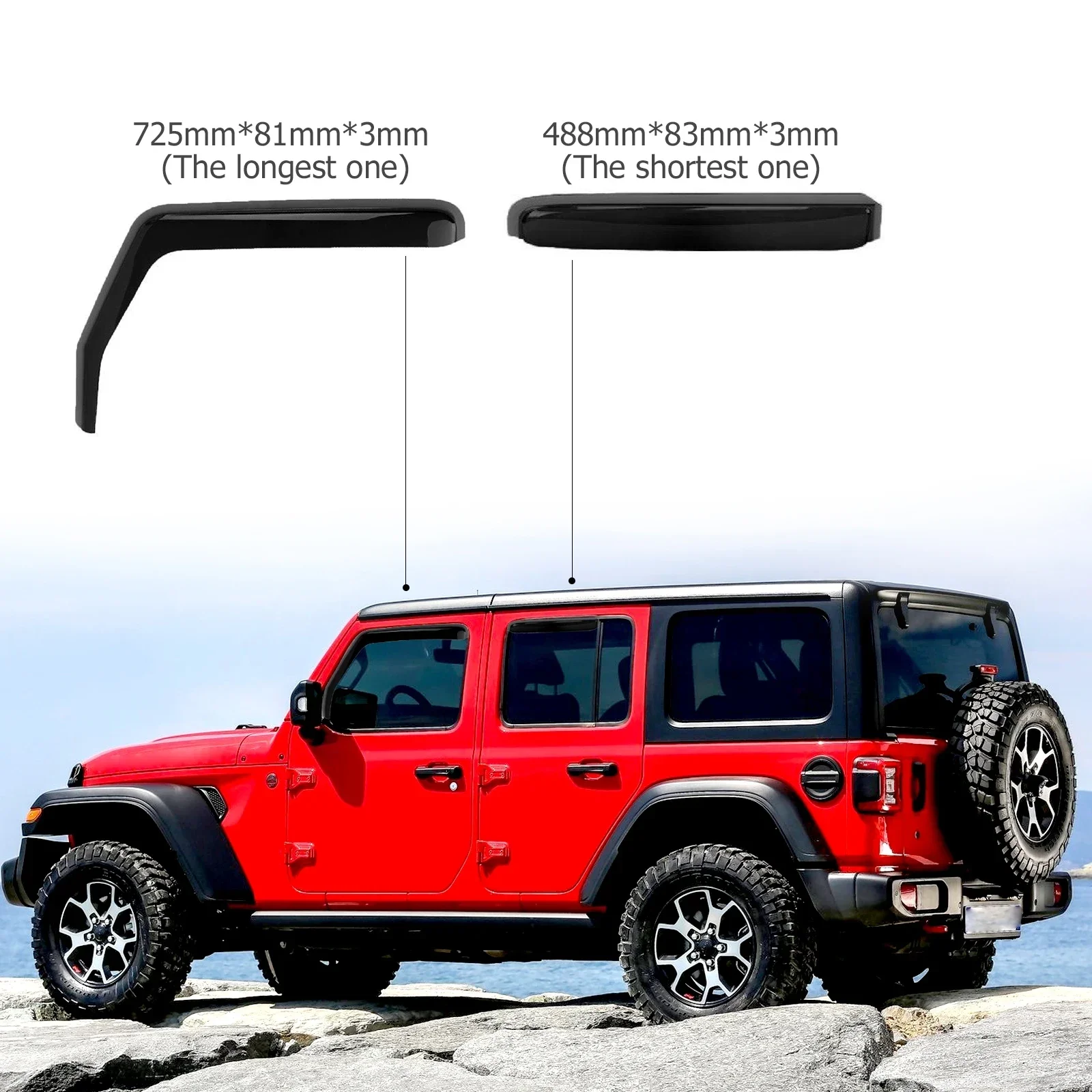 Upgrade your Jeep Wrangler JK (2007–2018) with these 4-Piece Side Window Awnings / Sun Visors / Wind & Rain Deflectors. Designed to shield windows from rain, wind, and sun glare, they allow ventilation while keeping your interior dry. Made from durable, high-quality materials, these visors are easy to install and add both functionality and style to your Wrangler.