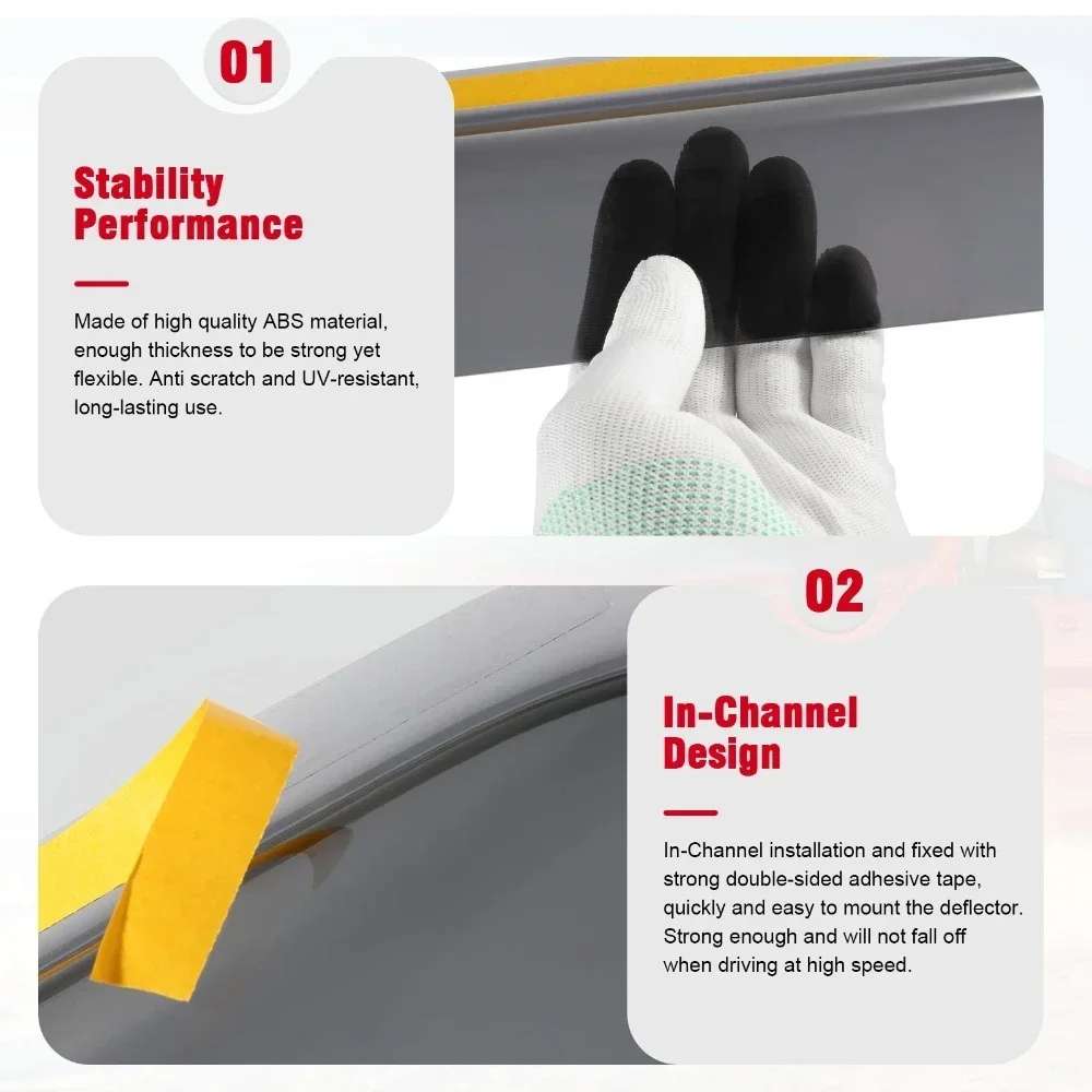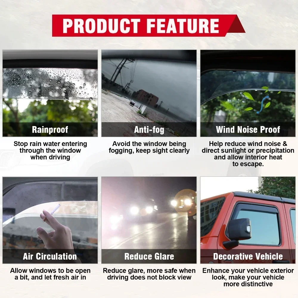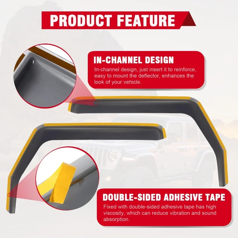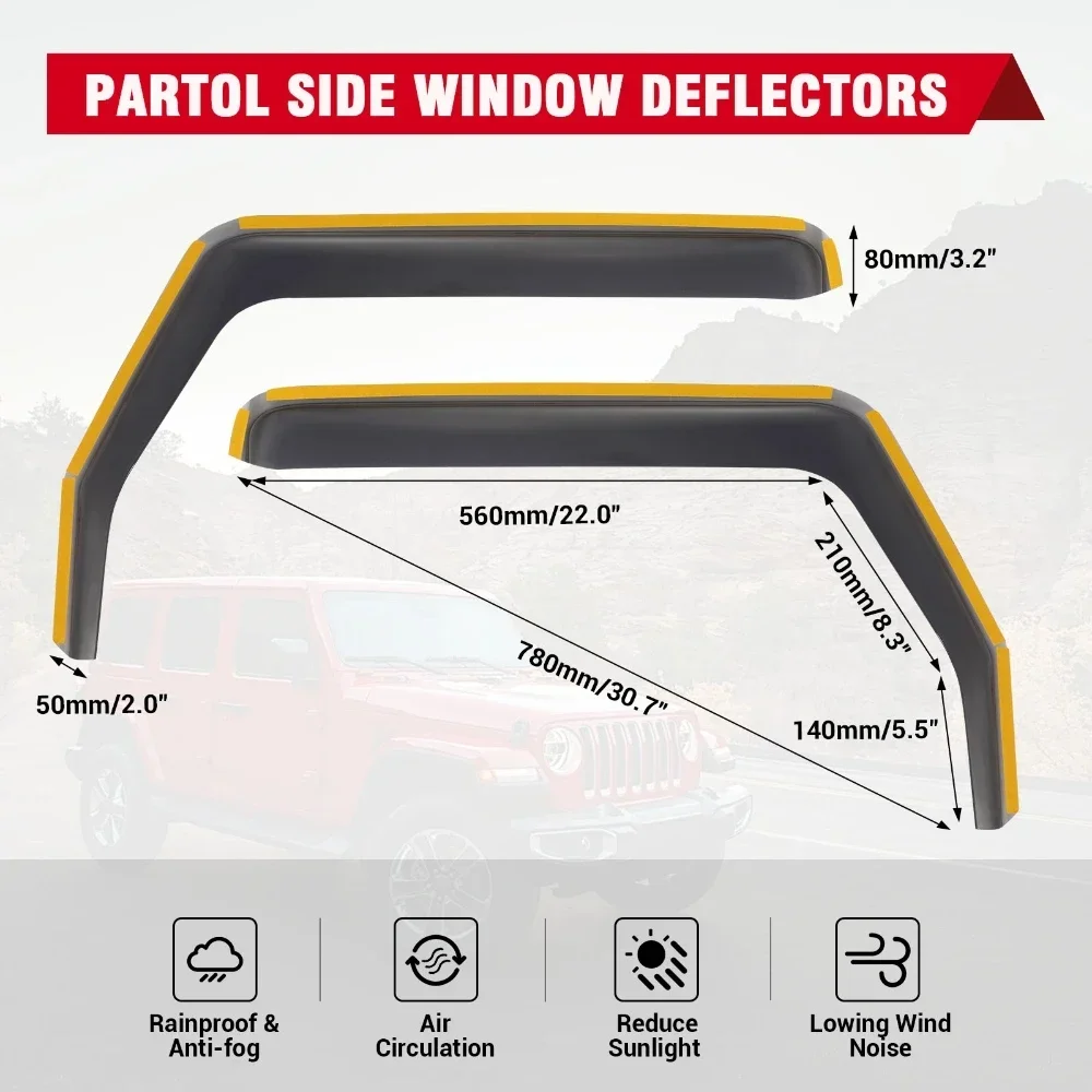 Protect and enhance your Jeep Wrangler JK (2007–2017, 2/4 Door) with these Window Rain Awnings / Sun Visors / Ventilation Guards. Designed to block rain, wind, and sun glare, they allow windows to remain slightly open for airflow without letting water or debris inside. Durable and easy to install, these visors are a functional and stylish accessory for your Wrangler.