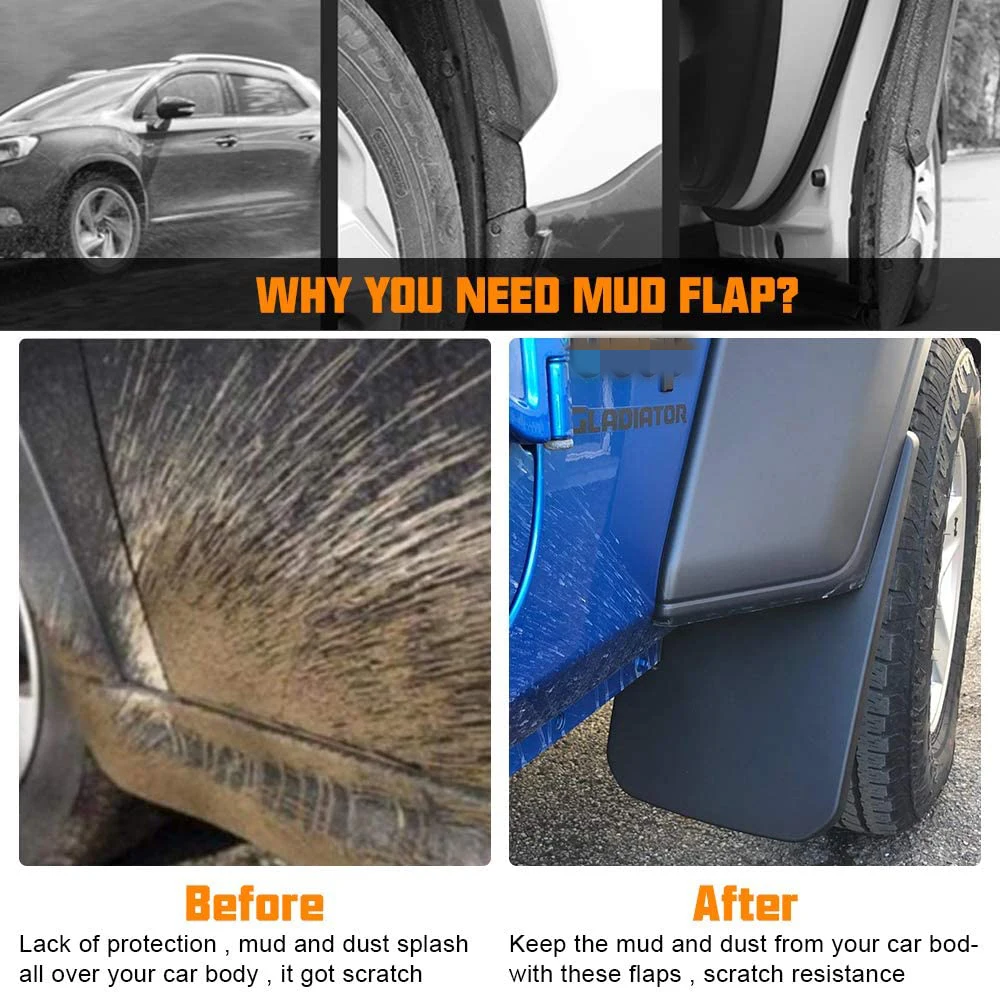 Protect your Jeep Wrangler JL & JT (2018–2023) with these Front and Rear Mud Flaps / Fender Splash Guards. Designed to shield your vehicle from mud, dirt, snow, and road debris, they keep your paint and fenders clean while enhancing durability. Made from high-quality, durable materials, these mudguards are perfect for both daily driving and off-road adventures.