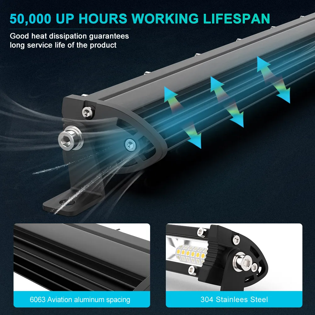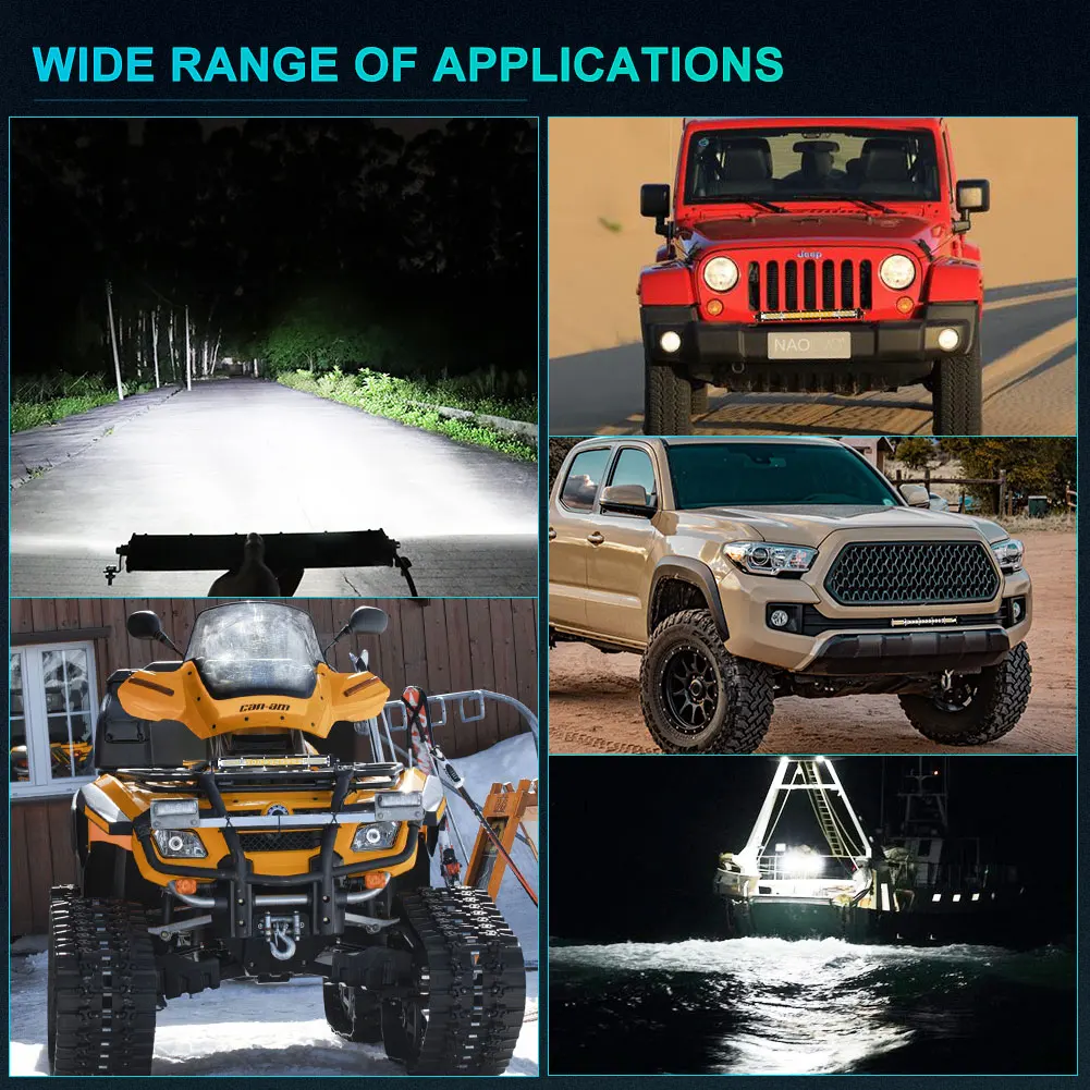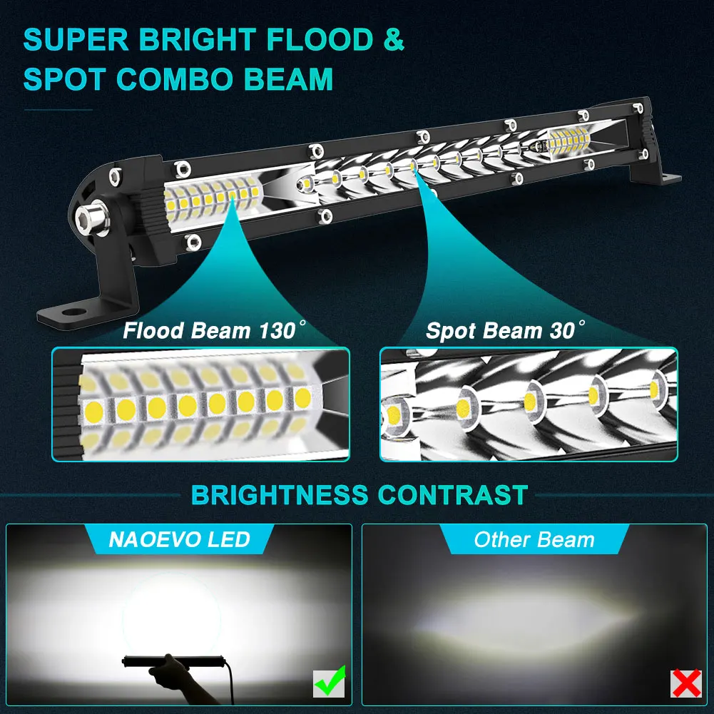Engineered for extreme environments, the NAOEVO Slim Bar uses an aluminum alloy housing, impact-resistant lens, and advanced cooling fins for reliable performance on rough terrain. Built to handle 12V and 24V systems, it easily mounts to bumpers, grilles, roofs, roll cages, and marine applications.