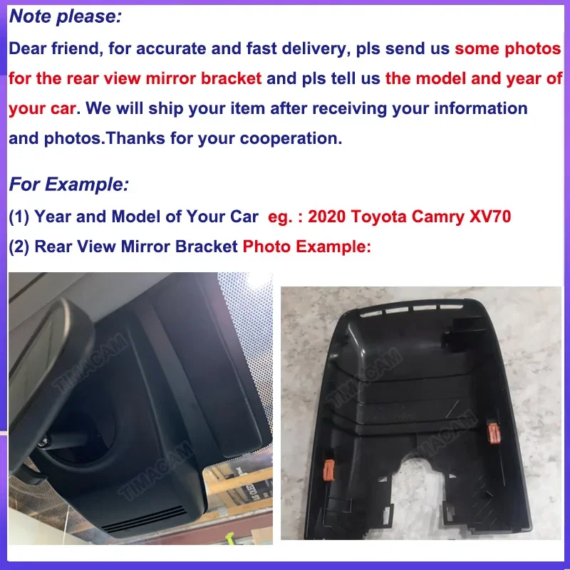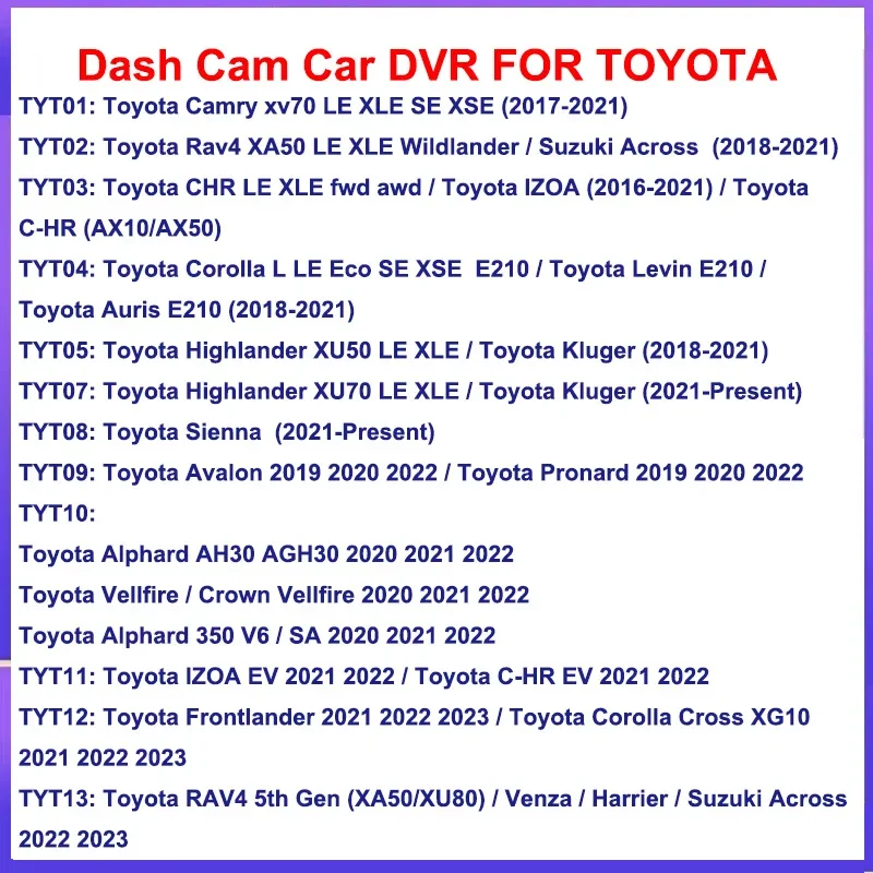 This Plug-and-Play WiFi Dash Cam is designed specifically for a wide range of Toyota models from 2016 to 2024, including Camry, Highlander, RAV4, CHR, Sienna, Corolla, IZOA, and Alphard.