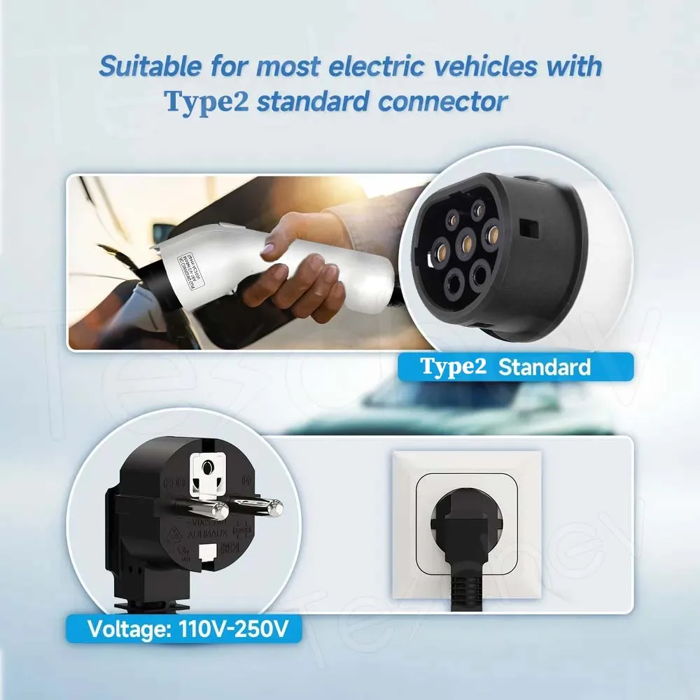 It supports IEC 62196 Type 2 connectors for broad compatibility with modern EVs.
