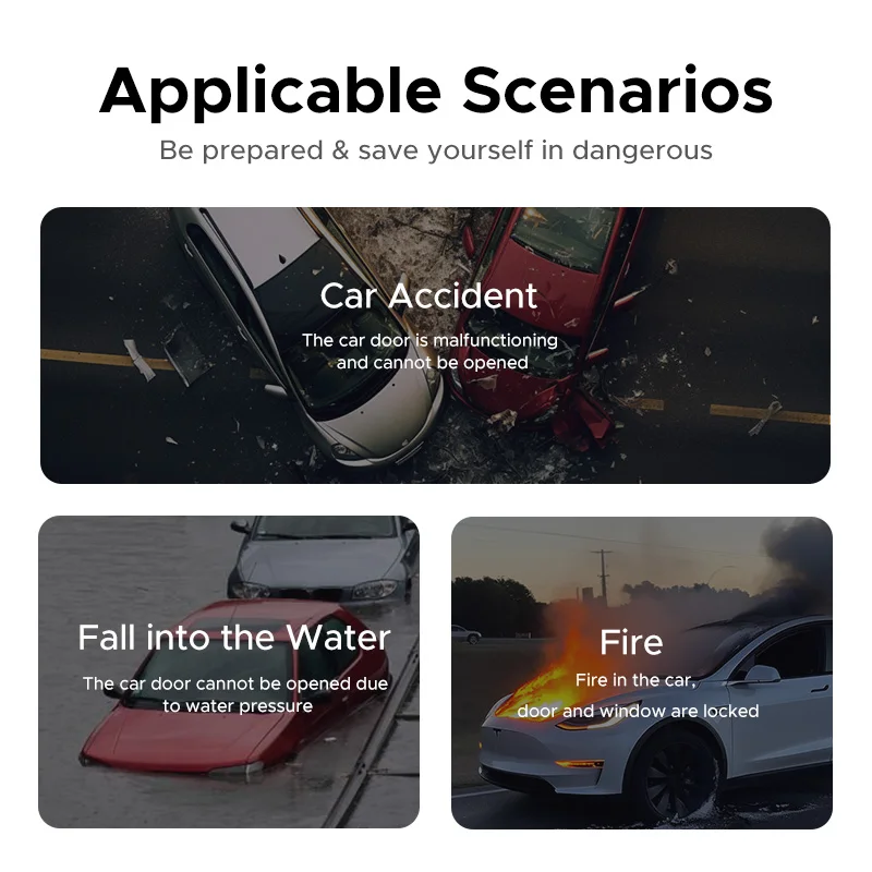 It features a hardened window glass breaker to quickly shatter side windows in emergencies.