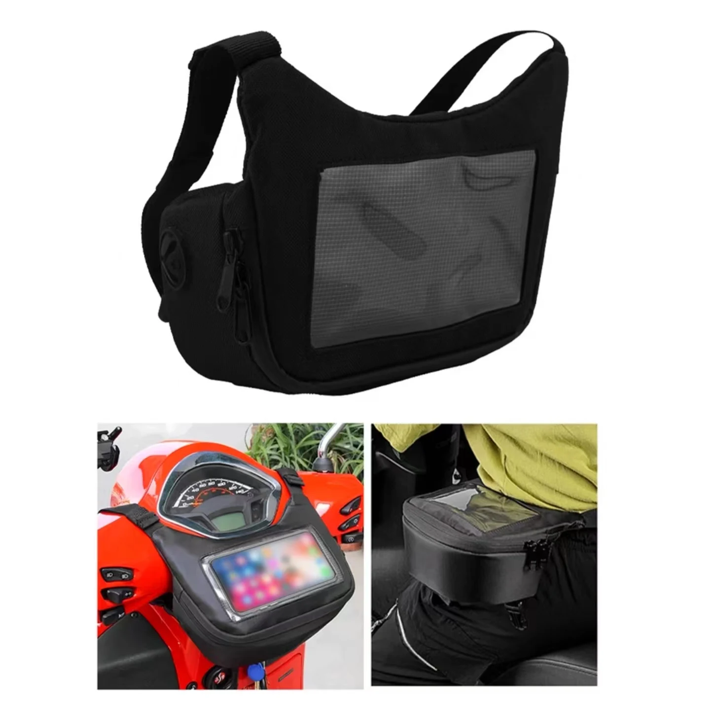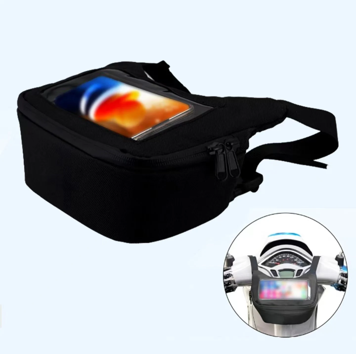 This waterproof handlebar bag is designed for motorcycles, scooters, and cycling use.